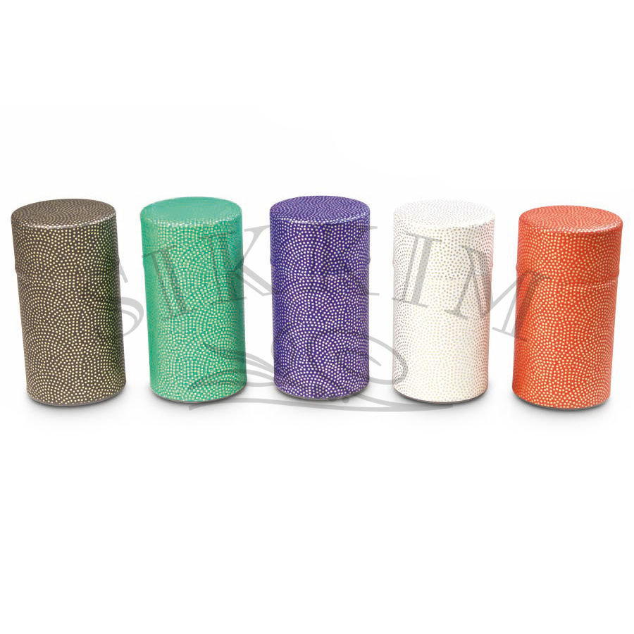 Przepiękna japońska puszka na herbatę oferowana pod nazwą Ayaka, oklejona dekoracyjną tkaniną, przez co posiadają unikalną fakturę w dotyku. Wewnątrz znajduje się dodatkowe metalowe wieczko dla podniesienia szczelności. Puszka ma ornamentowy wzór w odcieniach pomarańczowego i złotego, w sprzedaży online oferowane pojedynczo, gdzie pozostałe kolory są dostępne osobno. Wymiary zewnętrzne puski Ayaka to 65mm średnicy oraz 125mm wysokości. Opakowanie jest eleganckim dodatkiem każdej japońskiej ceremonii herbacianej lub jako prezent dla konesera japońskich herbat.