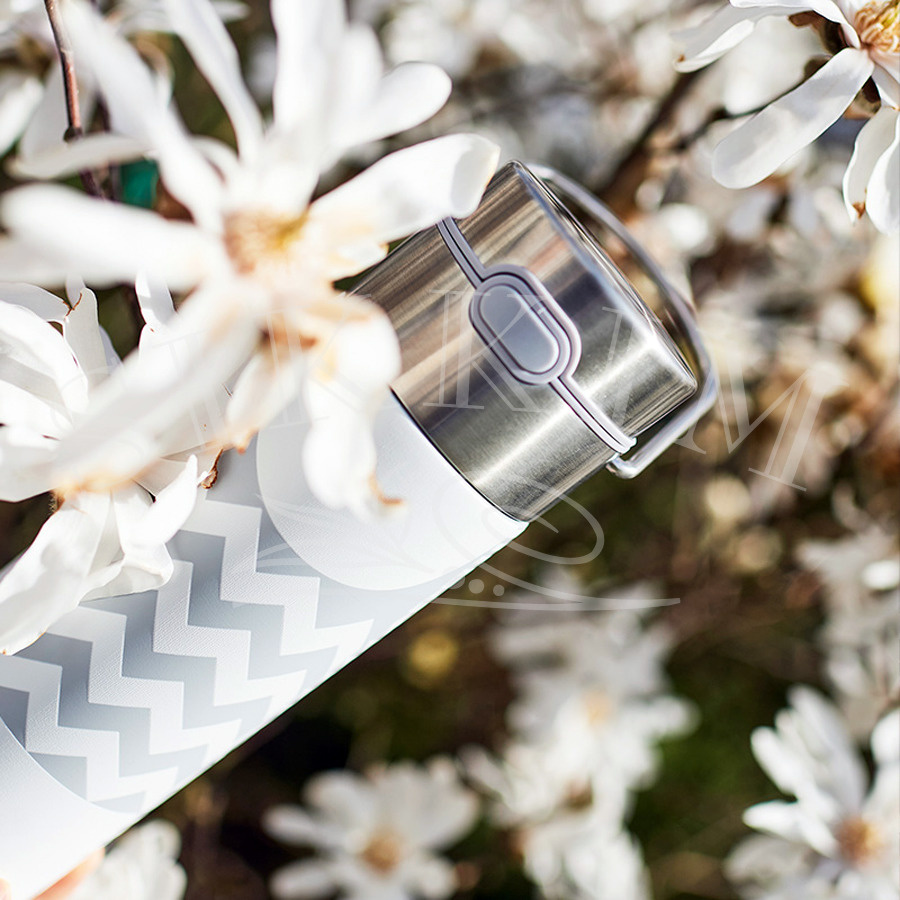 Motyw zdobiący stalowy termos jest nowoczesny i chwytający oko. Wpisuje się on w stylistykę pozostałych przedmiotów stanowiących kolekcję, jak na przykład kubki, czy metalowe puszki. W tym modelu przestawia on szaro srebrne figury geometryczne na białym tle. Urządzenie ma 23,5cm całkowitej wysokości (bez ruchomej rączki) i 7cm średnicy.