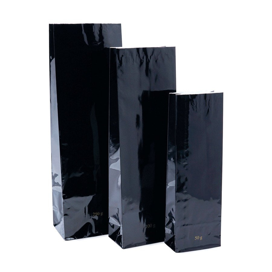Torebki do pakowania produktów sypkich, trójwarstwowe, lakierowane, dno blokowe, sprzedawana w większych opakowaniach zbiorczych. Wymiary ~ 80x50x250mm.